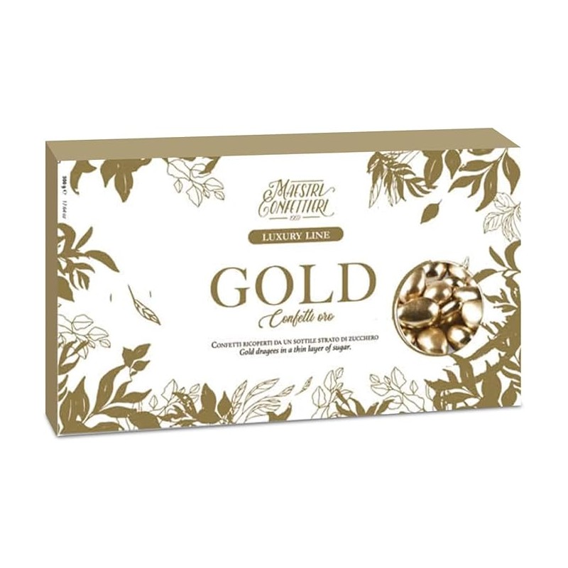 Confetti color oro alla nocciola tostata, senza glutine, ricoperti da un duplice strato di cioccolato bianco e fondente e rifiniti con un sottilissimo strato di zucchero color oro perlato. La confezione contiene tra 160 e 180 confetti ed è dotata di un talloncino ritagliabile sul retro, ideale da applicare su contenitori, bomboniere e allestimenti professionali. Eleganti, scenografici e di qualità premium, sono perfetti per matrimoni, anniversari, eventi di lusso e confettate raffinate.