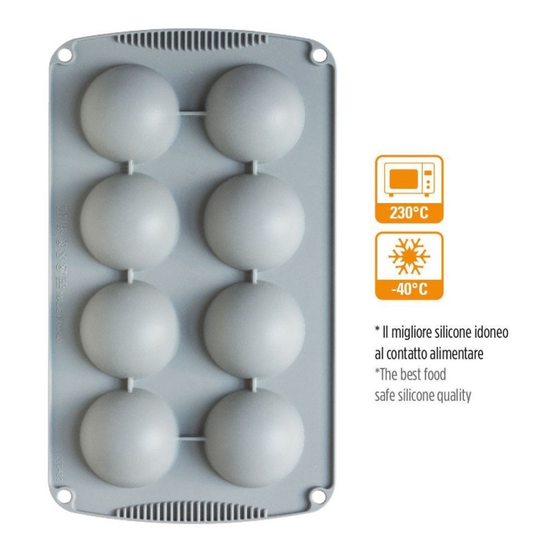 Stampo in silicone flessibile di alta qualità misurante cm 30 x 17 x 3 h con 5 cavità: cm ø 6 x h 3 cm, perfetto per preparazioni dolci e salate composto per il 100% da Silicone Platinum. Resiste perfettamente alla congelazione ed alla cottura. Non altera il sapore degli alimenti. Lavabile e riutilizzabile. Adatto al microonde e resistente fino a -40°C +230°C. Semplice da usare e facile da pulire. Un prodotto estremamente versatile, ideale per realizzare dolcetti o preparazioni salate sia da forno che da frigo come lievitati, budini, gelatine e dolcetti gelato: permette di creare forme così dettagliate da poterle servire direttamente senza ulteriore decorazione.